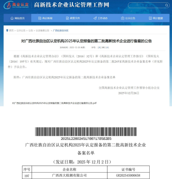发表时间:2026-01-07 11:33 近日,全国高新技术企业认定管理工作领导小组办公室公布“广西壮族自治区2025年第二批备案高新技术企业名单”,西大检测公司凭借坚实的研发实力、突出的技术创新能力及规范的经营管理,成功通过国家高新技术企业认定,正式跻身国家级高新技术企业行列,标志着公司在技术研发、科技成果转化等核心领域获得国家权威认可。