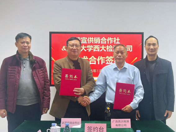 发表时间:2026-01-09 10:25 1月6日,西大检测公司与武宣供销合作社在广西大学科技园举行座谈签约会。武宣供销合作社党组成员、理事会副主任、广西大学校友徐术雄,广西沃达肥料科技公司总经理袁风,西大检测公司总经理沈方科等出席签约仪式。双方就深化“三农”服务、推动农业提质增效达成合作共识。 此次合作是高校科研力量与地方供销系统精准对接的实践,更是落实乡村振兴战略、深化供销社改革的重要举措。武宣供销合作社作为县域为农服务主力,拥有完善的农资供应、农产品流通等服务网络。西大检测公司作为广西大学所属的开展检验检测、技术服务和科研成果转化、推广应用的专门机构,在农产品检测、耕地质量保护等领域的技术优势与武宣农业发展需求高度契合。